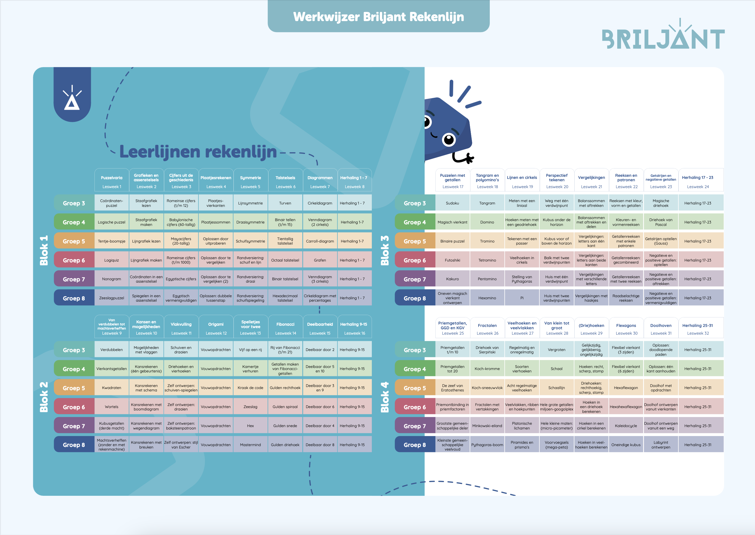 De rekenlessen zijn gevarieerd en uitdagend. Denk bijvoorbeeld aan onderwerpen zoals Fibonacci, talstelsels, origami, plaatjesrekenen, puzzelen met getallen of flexagons.